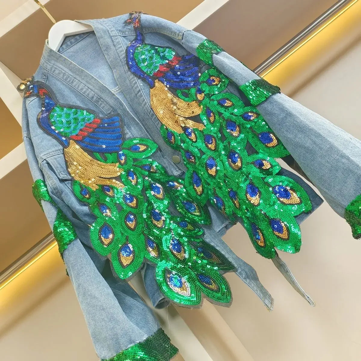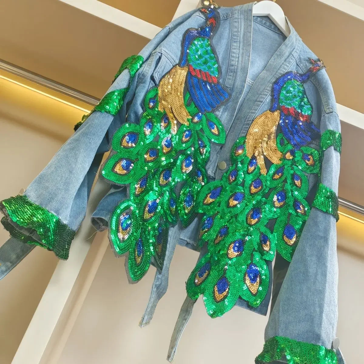 Women V-neck 3D Peacock Sequined Embroidery Jean Coat Autumn Animal Beaded Denim Jacket Shiny Streetwear Cardigan Tops Jaqueta